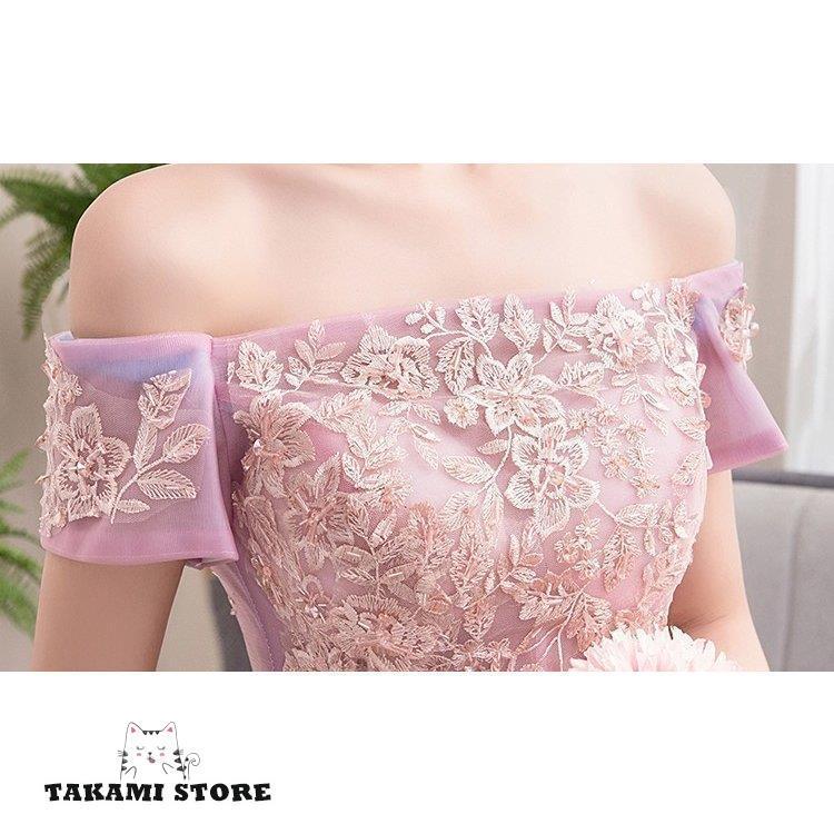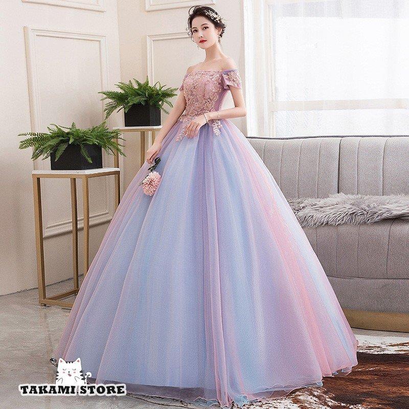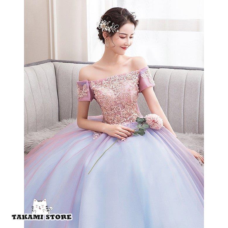 HOT ! ウエディングドレス カラードレス 二次会 花嫁 ロングドレス 大きいサイズ 3L オフショルダー 袖あり 半袖 レース プリンセスライン マキシ丈 チュール 刺繍