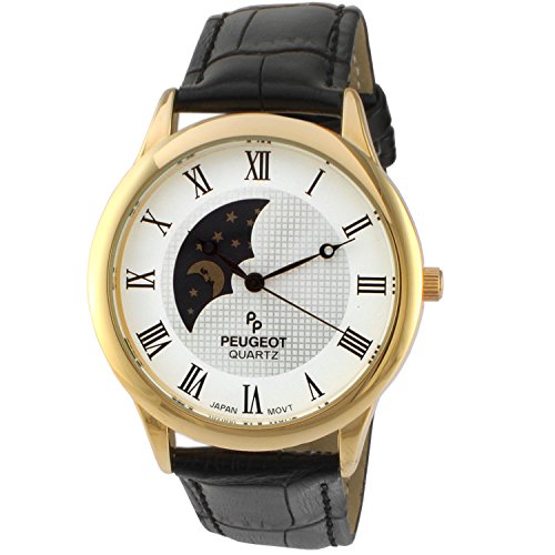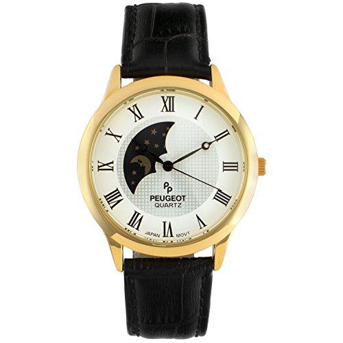 | 商品コメント | 在庫数以上の販売が可能な場合があります。 色やサイズ、その他バリエーションの問い合わせもお気軽にどうぞ♪ Peugeot Men's 14K Gold Plated Sun Moon Phase Vintage Dress Analog Watch with Leather Strap, Black |
