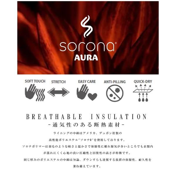 弊社の製品はライニングの中綿にアメリカ、デュポン社製の高性能ポリエステル"ソロナ®"を使用しております。ソロナポリマーは羽毛のような軽さと温かさで保湿性に優れ湿気が多いところでも衣類内が蒸れにくく心地の良い圧縮性と回復性の高さが特徴です。同じ厚みのポリエステルの中綿は勿論、ダウンすらも凌駕する抜群の保湿性、耐久性を兼ね備えています。